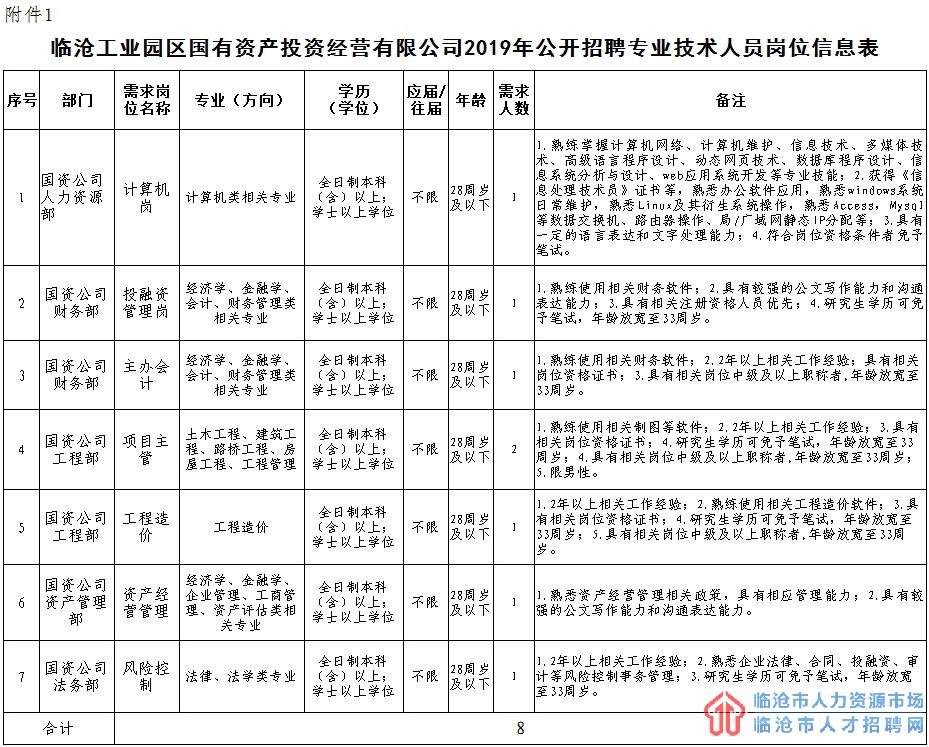 本次計劃招聘人員共8名,具體為:國資公司人力資源部計算機崗位人員1名,財務(wù)部投融資管理人員1名,財務(wù)部主辦會計1名,工程部項目主管2名,工程部工程造價人員1名,資產(chǎn)管理部資產(chǎn)經(jīng)營管理崗位人員1名,法務(wù)部風(fēng)險控制崗位人員1名。具體招聘職位條件詳見《臨滄工業(yè)園區(qū)國有資產(chǎn)投資經(jīng)營有限公司2019年公開招聘專業(yè)人員崗位信息表》(詳見附表)。