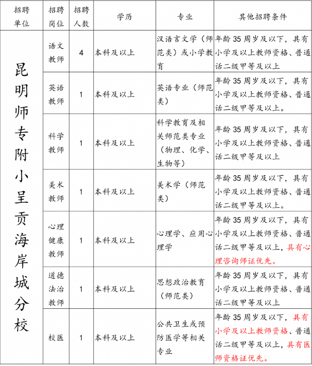 昆明師專附小呈貢海岸城分校2021年教師招聘公告